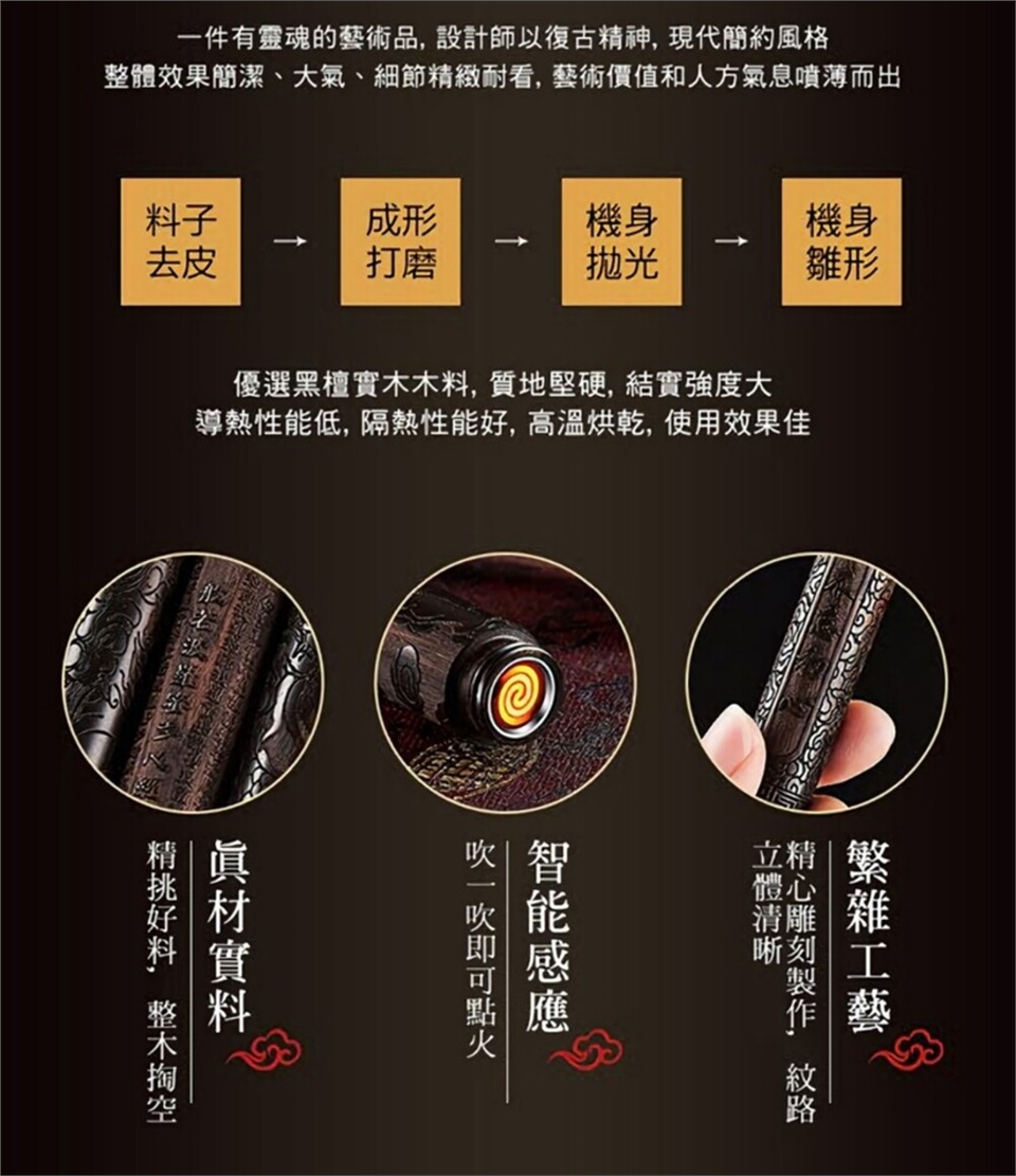 精緻木雕與科技巧妙融合:我們的打火機不僅外觀優雅、精緻的木雕為其外衣,更搭載了充電式打火機的精密機芯。這不僅是一款打火機,更是一件融合藝術與科技的精品。