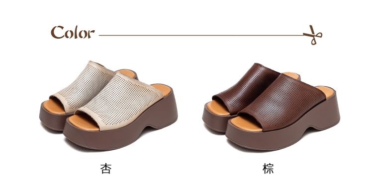 【VECCHIO】全真皮洞洞坡跟厚底拖鞋/全真皮頭層牛皮復古深口縷空洞洞坡跟厚底拖鞋 女鞋 杏