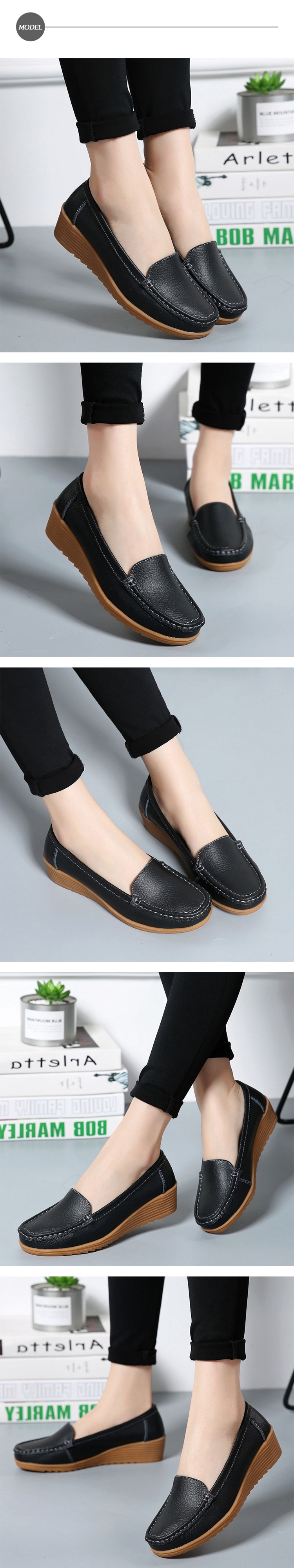 【MOM】真皮純色坡跟休閒鞋/真皮純色素面百搭舒適坡跟休閒鞋 女鞋 黑