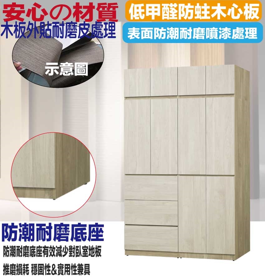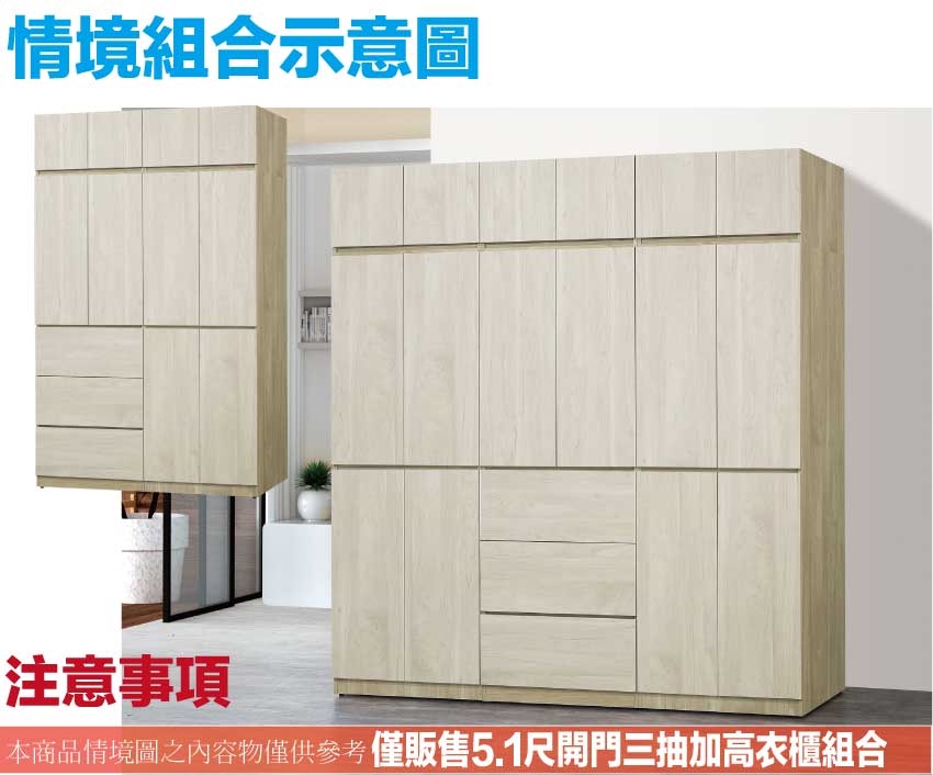 【文創集】瑞歐雙色5.1尺多門三抽加高衣櫃組合 木紋雙色系+安心材質製造,使用放心+搭配居家更便利,採用防蛀木心板+防潮耐磨底座+防夾手緩衝門片五金+五金滑軌結構等安心材質製造 ,外層採用防潮耐磨噴漆處理搭配開門櫃+吊衣桿+三抽屜+內開放層格等收納空間設計,全由專人配送到家,專業安心服務,替你省下更多時間!