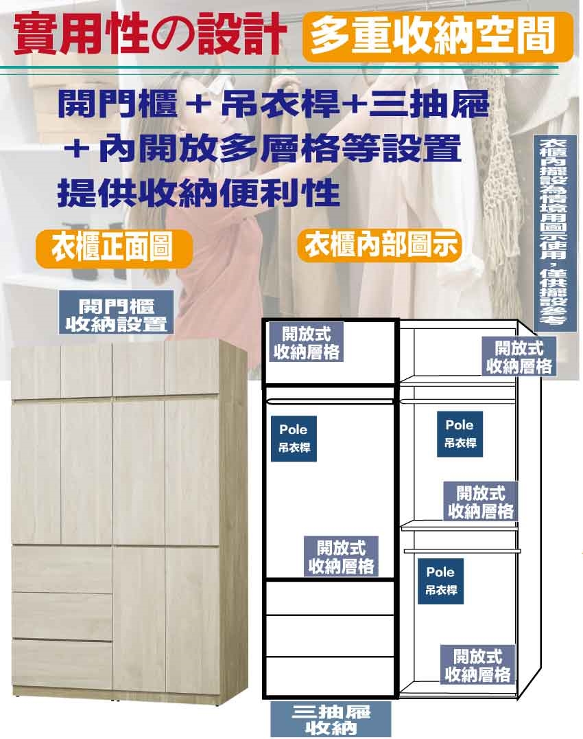 搭配開門櫃+吊衣桿+三抽屜+內開放層格等收納空間設計