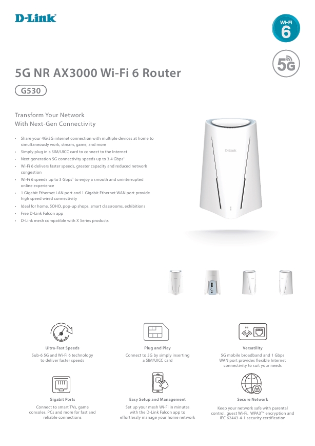 可向下相容4G SIM卡,支援4G LTE Cat.19行動網路,並具備 5CA 載波聚合,下載速率可達1.6Gbps