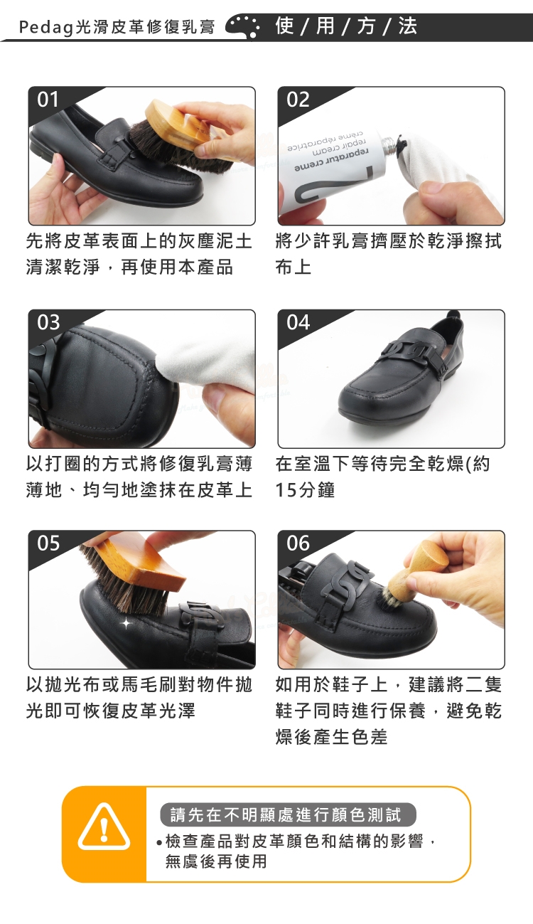 請先在不明顯處進行顏色測試,檢查產品對皮革顏色