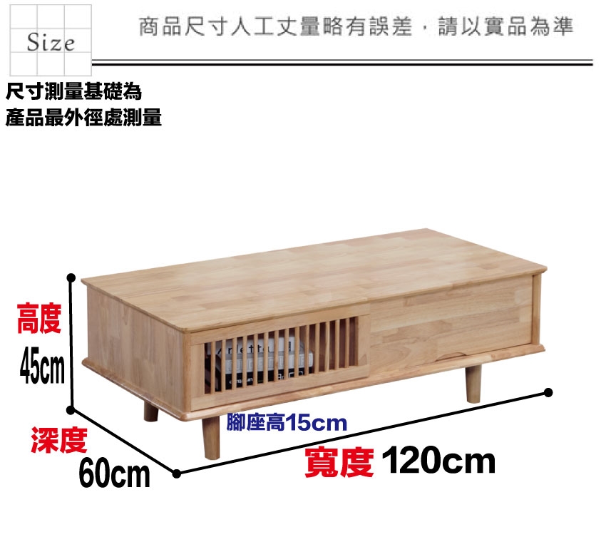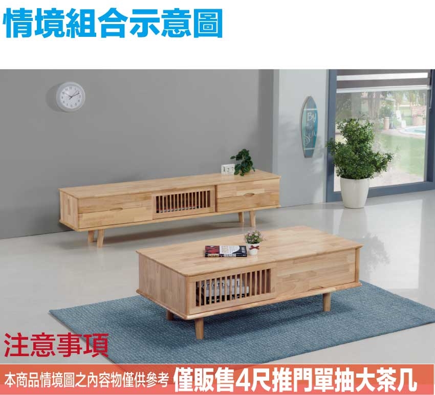 【文創集】達歐實木4尺推門單抽大茶几 原木紋色系+安心材質製造,使用放心+搭配居家更便利,採用橡膠木實木+實木圓柱腳座等安心材質製造 ,外層採用防潮耐磨噴漆處理搭配採用上掀式門櫃+單抽屜+內開放層格等收納空間設計,全由專人配送到家,專業安心服務,替你省下更多時間!