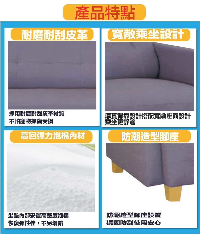 採用內部實木框架+耐磨造型腳座+耐磨耐刮皮革+高回彈泡棉等安心材質製造