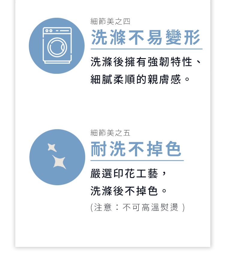 3. 避免破壞布料,勿使用漂白劑、螢光增白劑及衣物柔軟劑