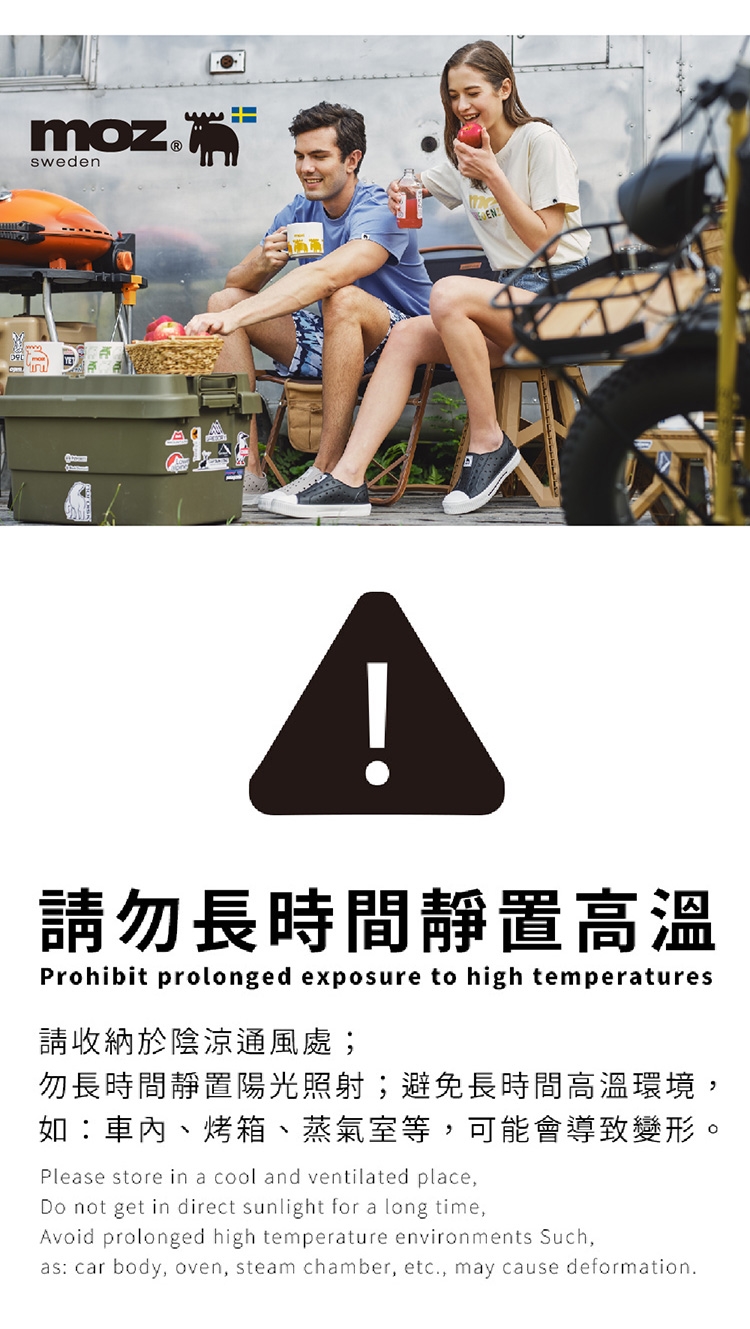 ※請收納於陰涼通風處,勿長時間靜置陽光照射;避免長時間高溫環境, 如:車內、烘乾機、烤箱、蒸氣室等,可能會導致變形。