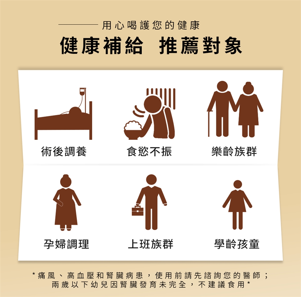 -痛風、高血壓和腎臟病患,使用前建議請先諮詢您的醫師。