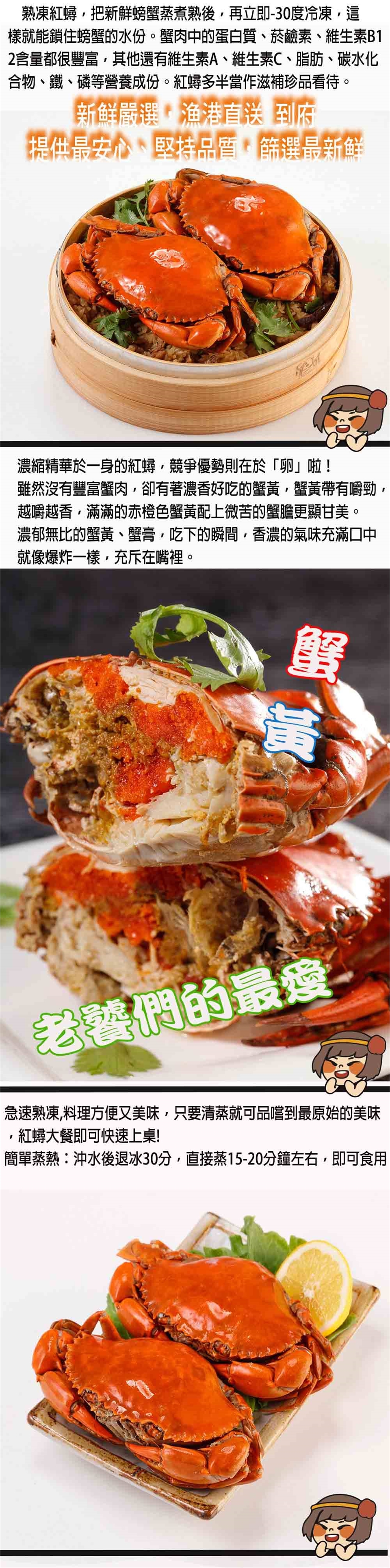◎ 把新鮮螃蟹蒸煮熟後,再立即零下20度冷凍,這樣就能鎖住螃蟹的水體型大又肥美、蟹黃非常迷人爽感十足的紅蟳,滿滿蟹黃