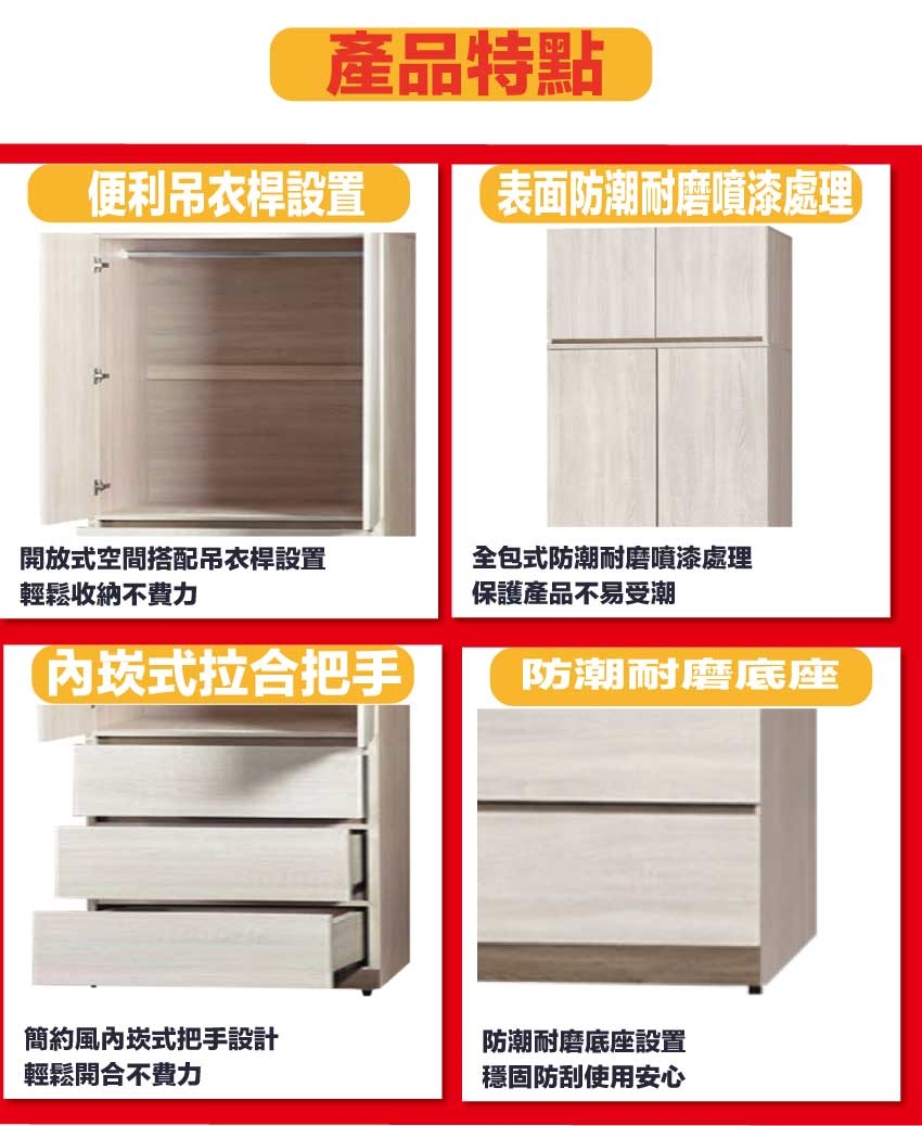 【文創集】歐瑞雙色2.7尺四門三抽加高衣櫃組合 木紋雙色系+安心材質製造,使用放心+搭配居家更便利,採用防蛀木心板+防潮耐磨底座+防夾手緩衝門片五金+五金滑軌結構等安心材質製造 ,外層採用防潮耐磨噴漆處理搭配採用開門櫃+吊衣桿+三抽屜+內開放層格等收納空間設計,全由專人配送到家,專業安心服務,替你省下更多時間!