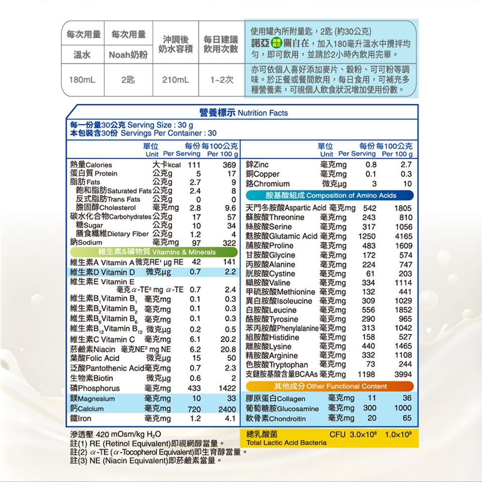 亦可依個人喜好添加麥片、穀粉、可可粉等調味。於正餐或餐間飲用,每日食用,可補充多種營養素,可視個人飲食狀況增加使用份數。