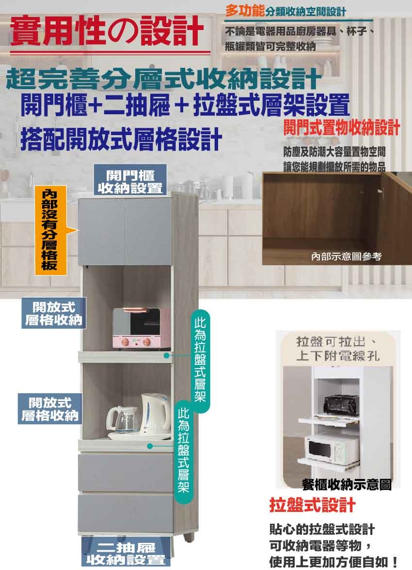 搭配採用開門櫃+拉合式層架+二抽屜+內外開放層格等收納空間設計