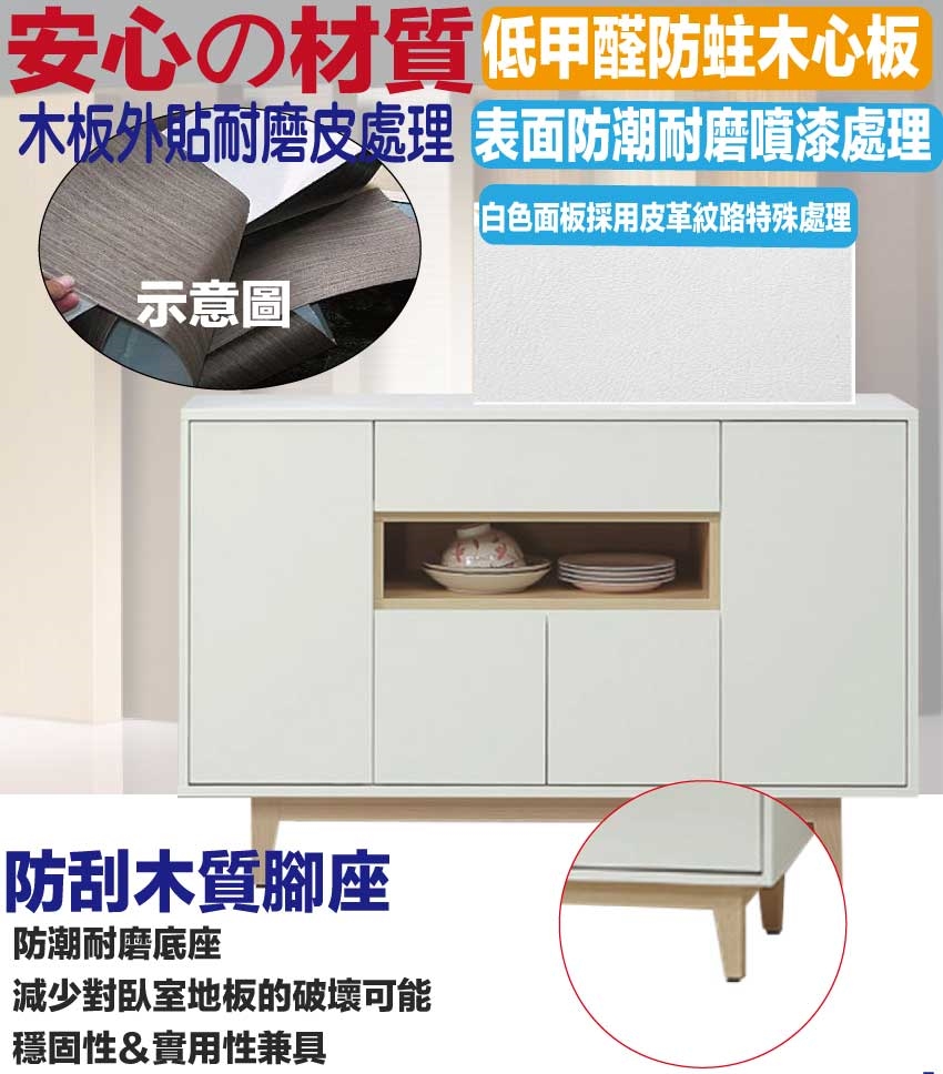採用防蛀木心板+防潮耐磨底座+防夾手緩衝門片五金+白色面板外層採用皮革紋路特殊處理等安心材質製造