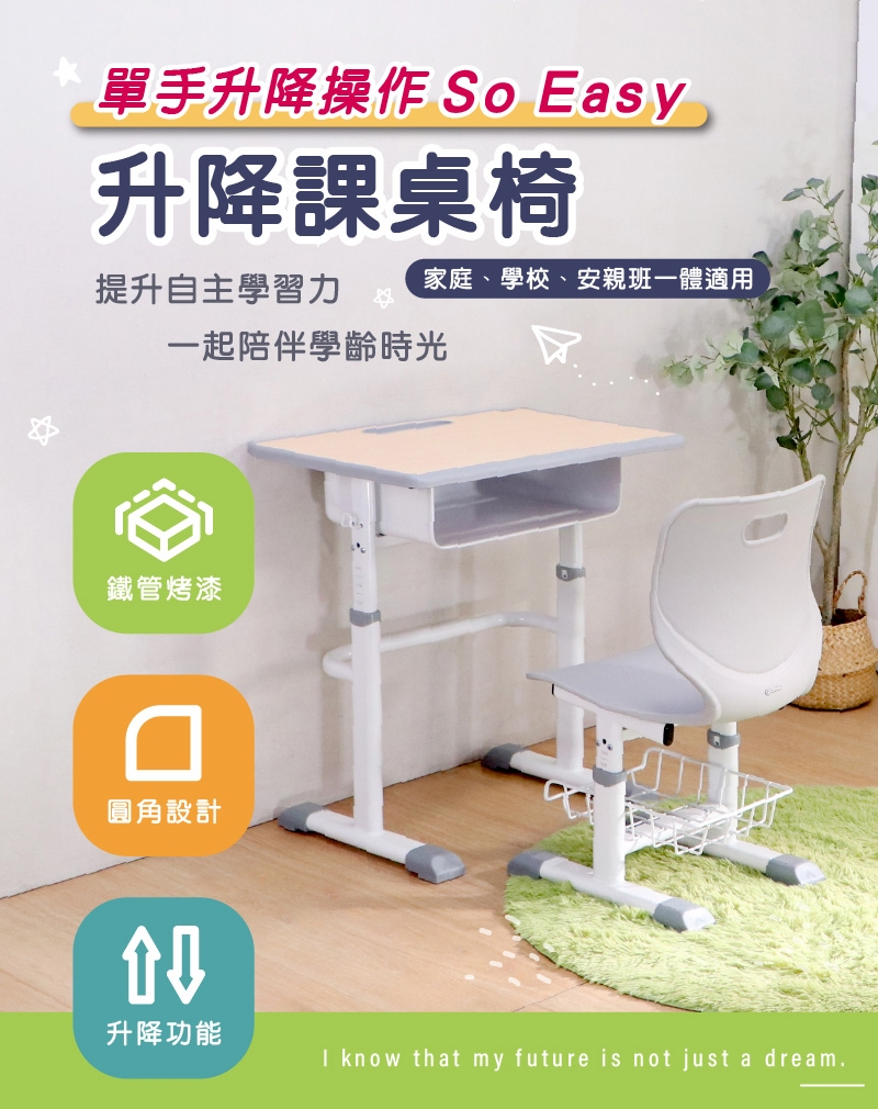 使用調節把桿可輕鬆單手調整桌椅高度,靈活配合成長需求與不同情境。