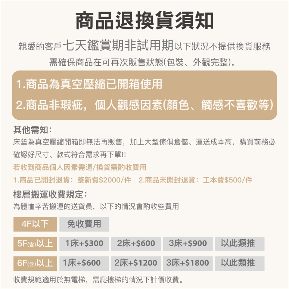 搬上樓及舊床回收服務將支付額外費用請參考運費計算