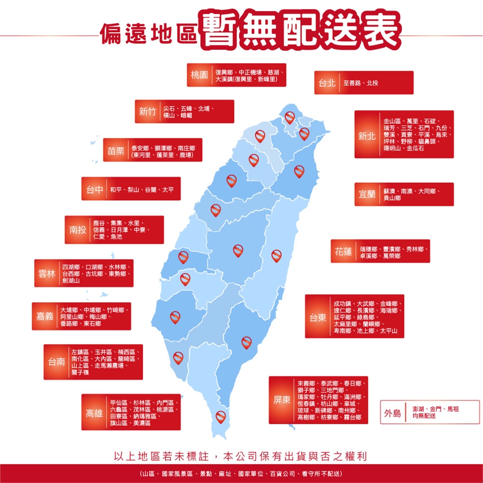 因商品無存貨特殊地型限制、偏遠鄉鎮、山區(含部分宜花東地區及外島)配送或搬運困難,等特殊情況無法送貨時DESMOND保有出貨與否權利