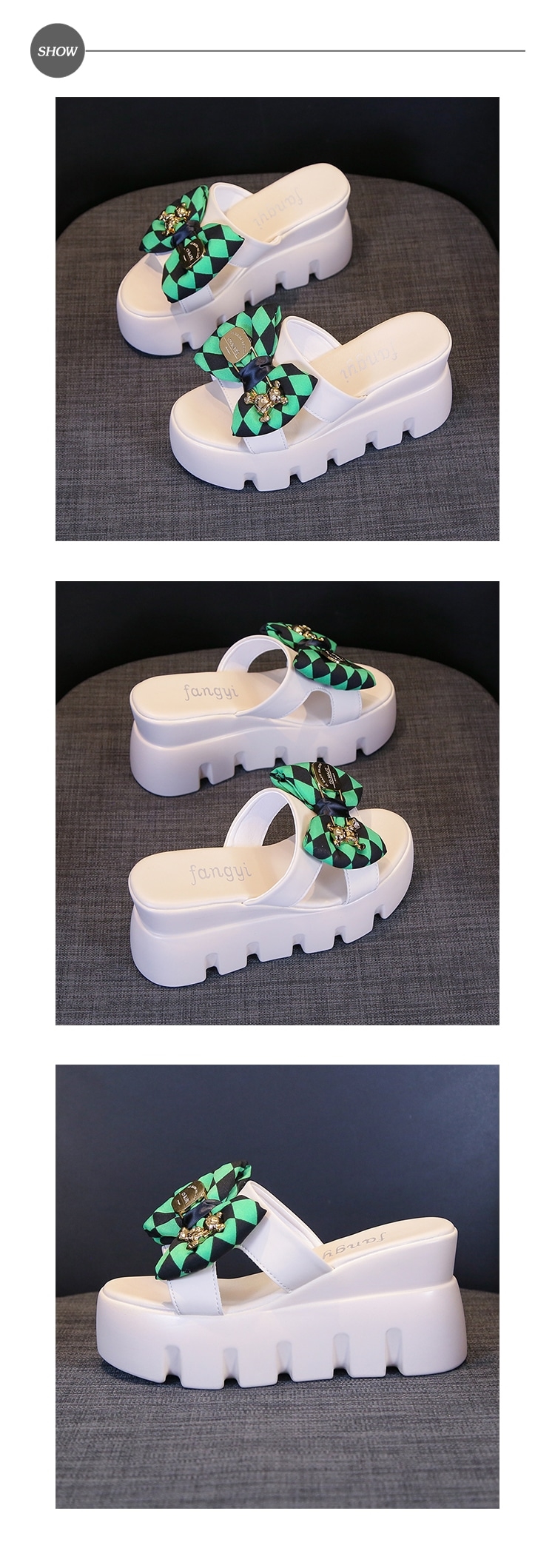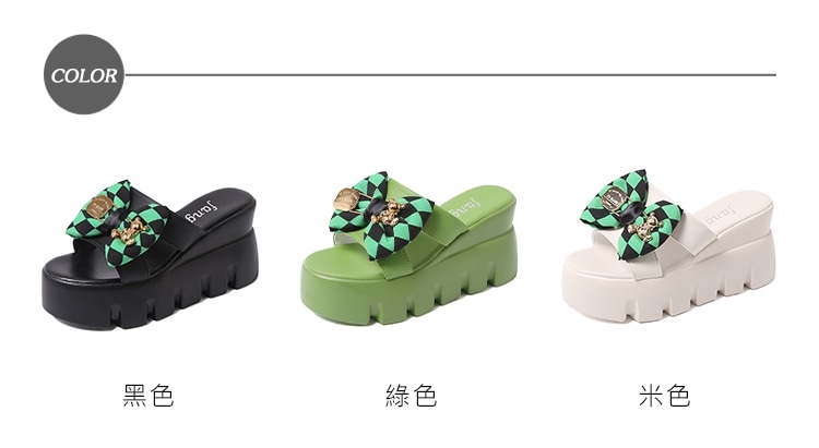 【HMH】撞色格子坡跟厚底拖鞋/黑綠撞色格子蝴蝶結坡跟厚底拖鞋 女鞋 米
