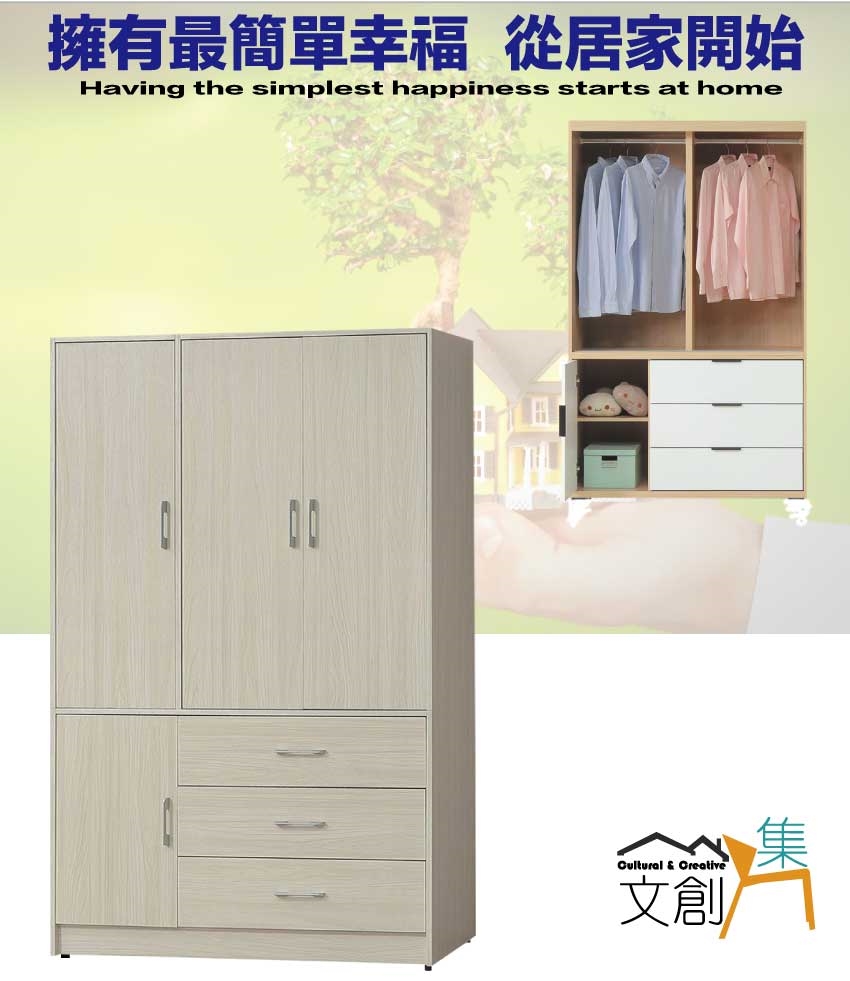 【文創集】普伊斯4.1尺四門三抽衣櫃 白榆木紋色系+安心材質製造,使用放心+搭配居家更便利,採用防蛀木心板+防潮耐磨底座+防夾手緩衝門片五金+五金滑軌結構等安心材質製造 ,外層採用防潮耐磨噴漆處理搭配採用開門櫃+吊衣桿+三抽屜+內開放層格等收納空間設計,全由專人配送到家,專業安心服務,替你省下更多時間!