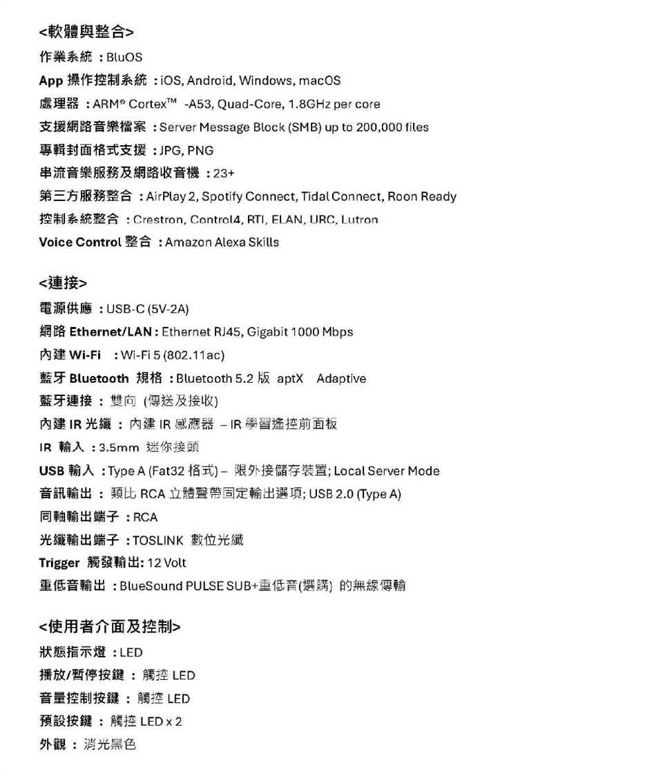 第三方服務整合 : AirPlay 2、Spotify Connect、Tidal Connect、Roon Ready