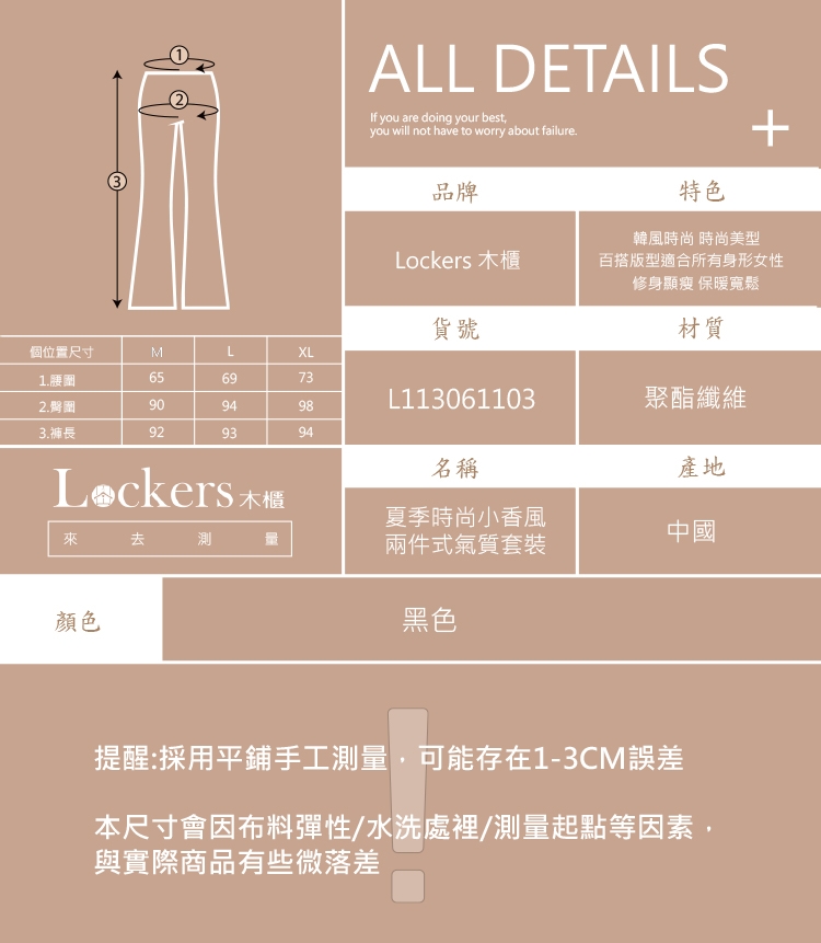 L 衣長63 胸圍106 肩寬38 / 褲長39 腰圍101 臀圍110
