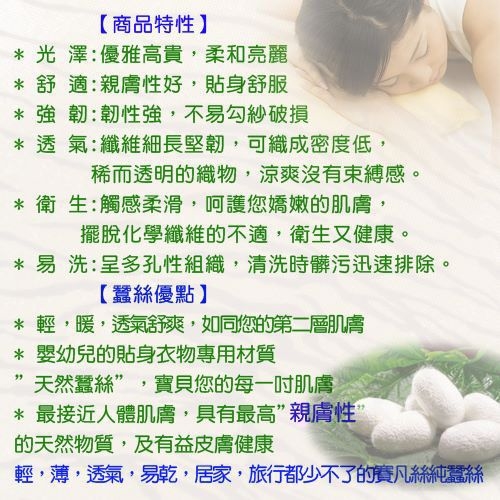 ‧蠶絲的特性:親膚、保健、舒適、吸濕、透氣、保暖、輕便強韌、易洗…