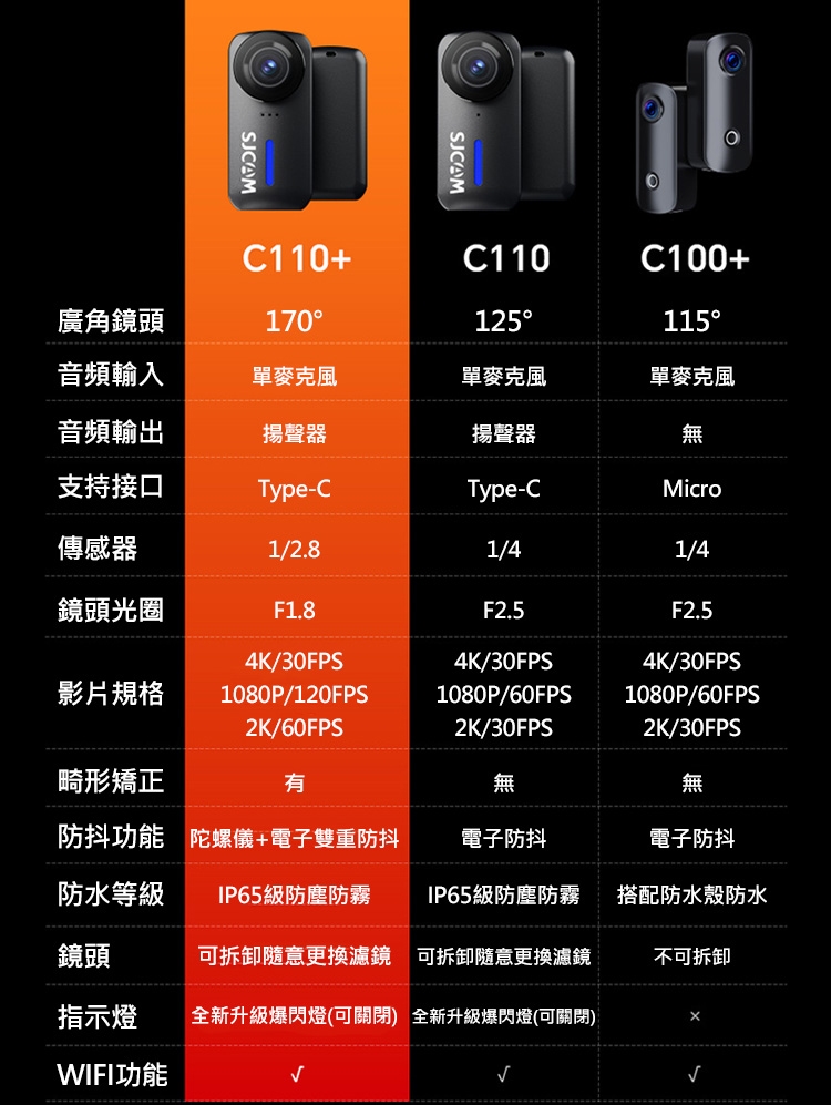 .產品內容:C110+主機X1、防水殼X1、邊框X1、背夾X1、鎖緊螺絲X1、底座X1、頭盔底座X2、3M膠貼X2、雲台轉接頭X1、、1/4轉接頭X1、掛繩X1、擦拭布X1、SJCAM貼紙X1、Type-C數據線X1、說明書X1