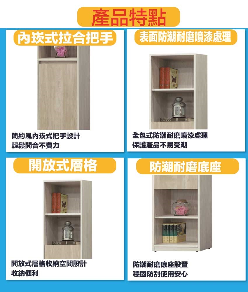 【文創集】恩斯1.3尺單門開放書櫃     木紋雙色系+安心材質製造,使用放心+搭配居家更便利,採用防蛀木心板+防潮耐磨腳座等安心材質製造 ,外層採用防潮耐磨噴漆處理搭配採用開門櫃+內&外開放式層格等收納空間設計,全由專人配送到家,專業安心服務,替你省下更多時間!