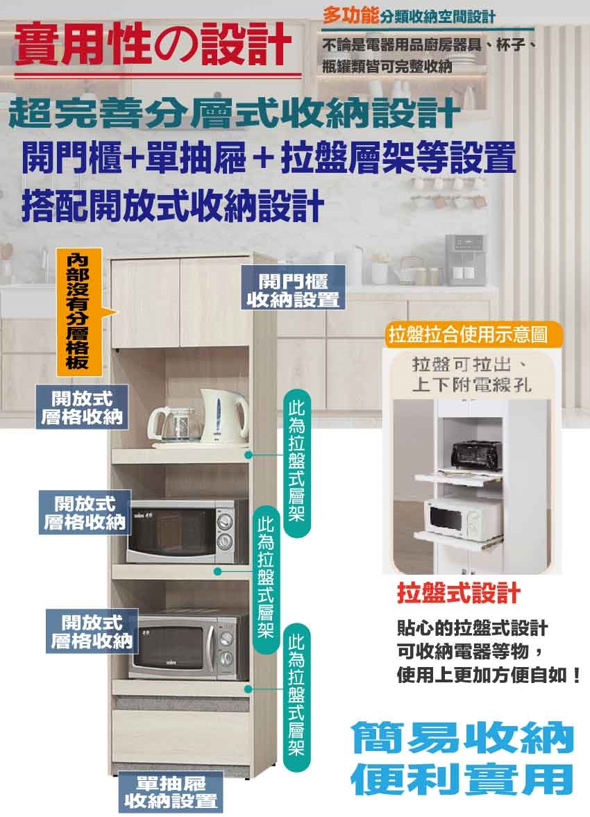採用開門櫃+拉盤層架+單抽屜+內&外開放層格等收納空間設計