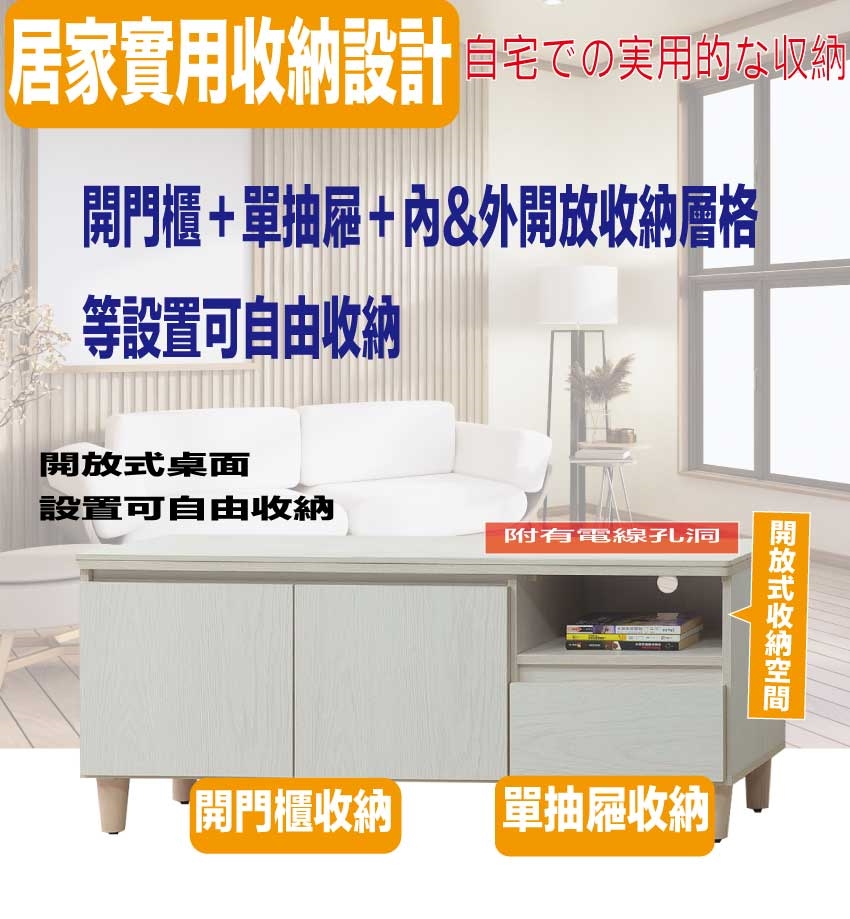 搭配採用開門櫃+單抽屜+開放式層格等收納空間設計