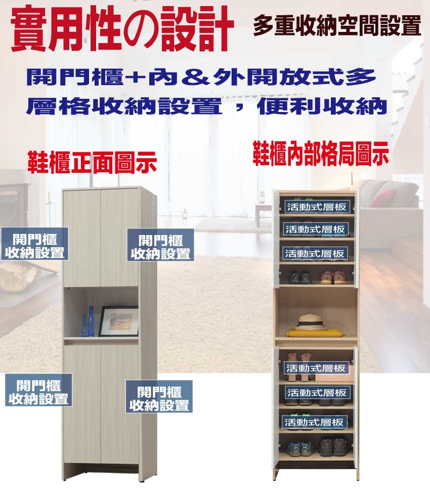 【文創集】美斯2尺四門高玄關鞋櫃(二色可選) 二色可選+安心材質製造,使用放心+搭配居家更便利,採用防蛀木心板+防潮耐磨底座等安心材質製造 ,外層採用防潮耐磨噴漆處理搭配採用開門櫃+內&外開放式層格等收納空間設計,全由專人配送到家,專業安心服務,替你省下更多時間!