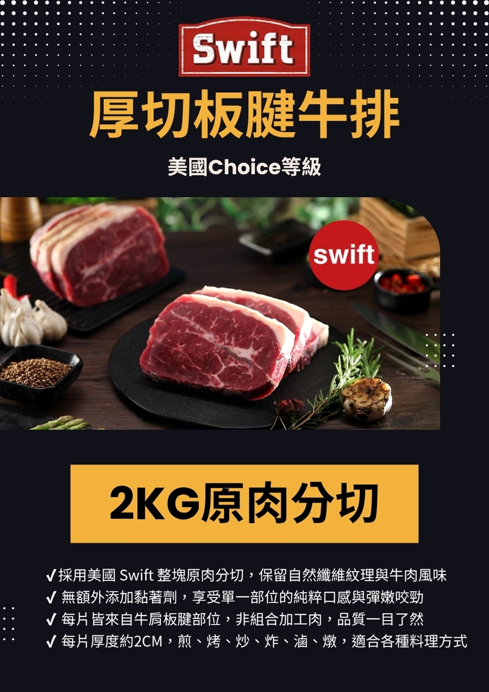 商品詳細介紹 體驗說明 主商品:美國百年品牌choice級原切嫩煎板腱牛排2000g±5%/包*1包 (不開放體驗) 使用方法說明 退冰後放到鍋中加熱,料理後依照各人喜好熟度食用 注意事項 收到貨請立即放入冷凍保存