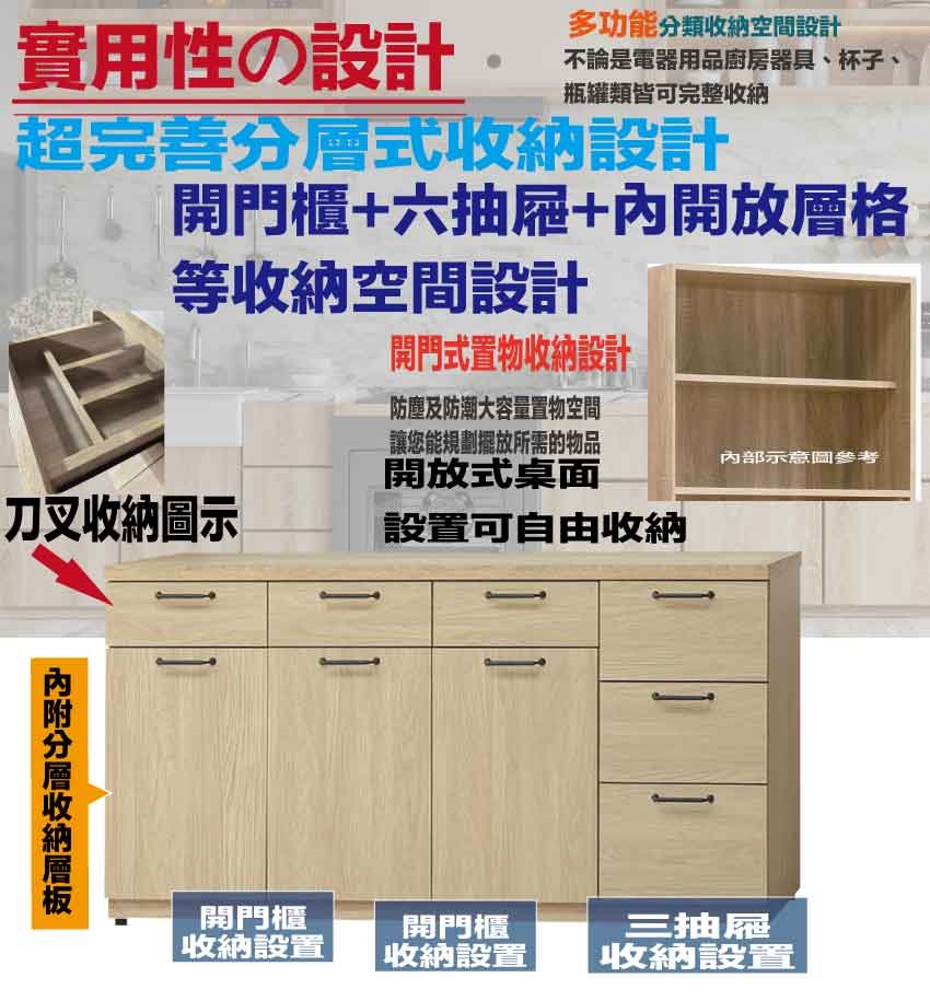 搭配採用開門櫃+六抽屜(含刀叉收納抽)+內&外開放層格等收納空間設計