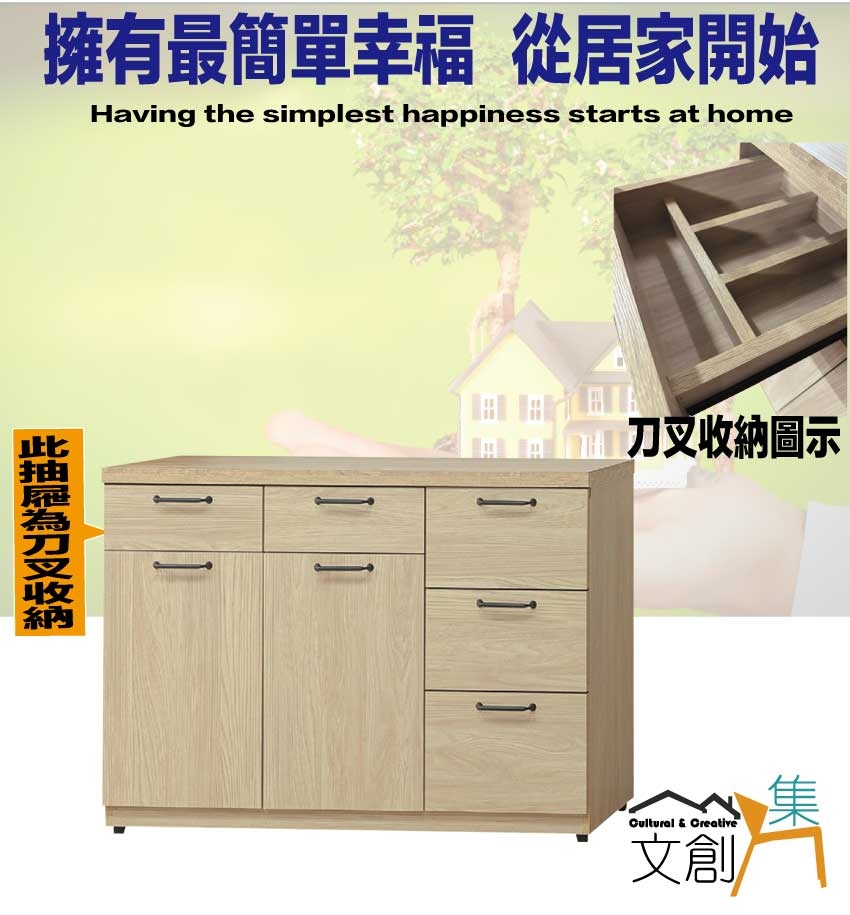 【文創集】芮德爾4尺二門五抽低餐櫃 橡木紋色系+安心材質製造,使用放心+搭配居家更便利,採用防蛀木心板+防潮耐磨底座+防夾手緩衝門片五金+五金滑軌結構等安心材質製造 ,外層採用防潮耐磨噴漆處理搭配採用開門櫃+五抽屜(含刀叉收納抽)+內&外開放層格等收納空間設計,全由專人配送到家,專業安心服務,替你省下更多時間!