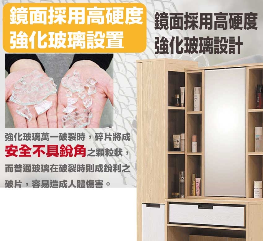 採用防蛀木心板+五金滑軌結構+強化玻璃鏡面+防潮耐磨底座等安心材質製造