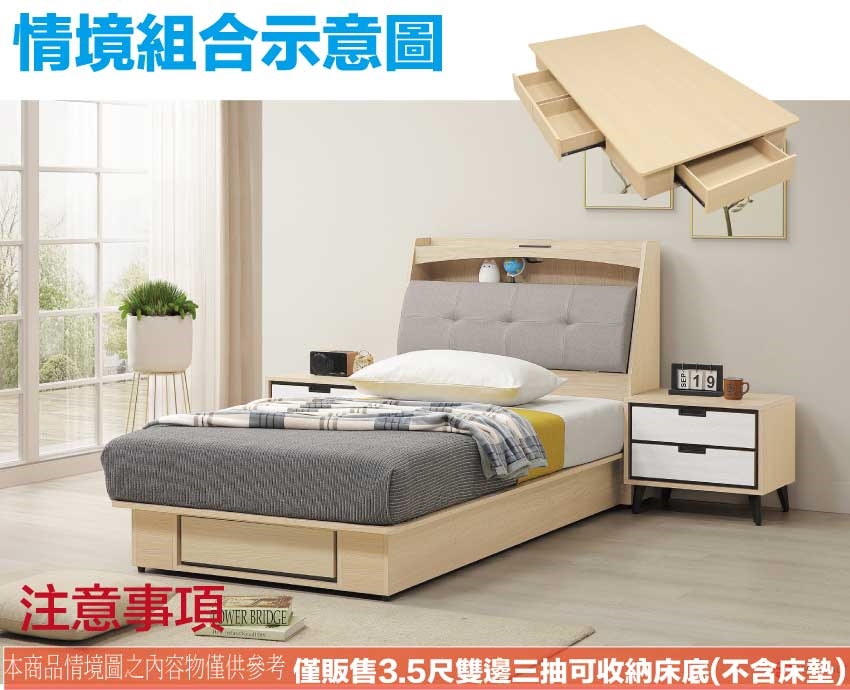 搭配床底座雙邊開合三抽屜等收納空間設計