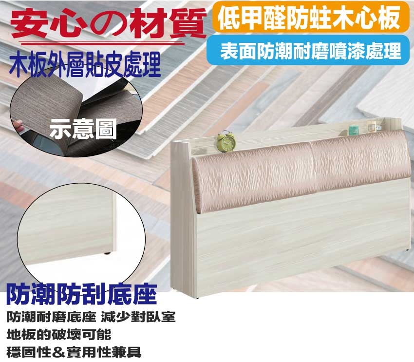 搭配床頭可掀式床枕板+內&外開放層格+便利插座設置等收納空間設計