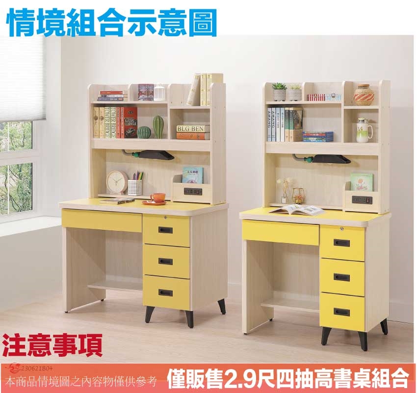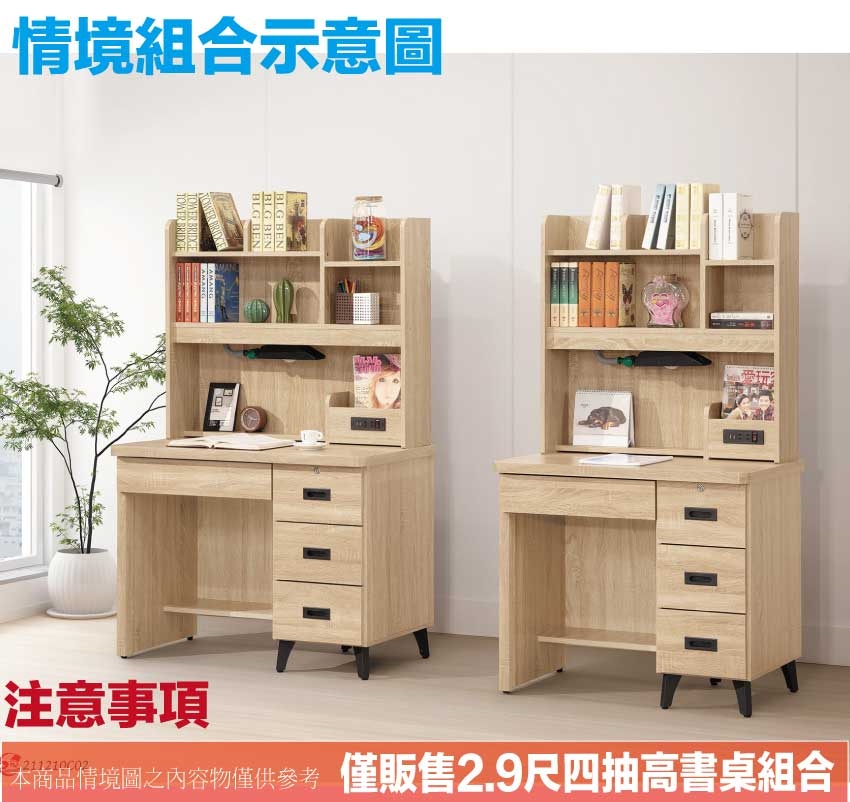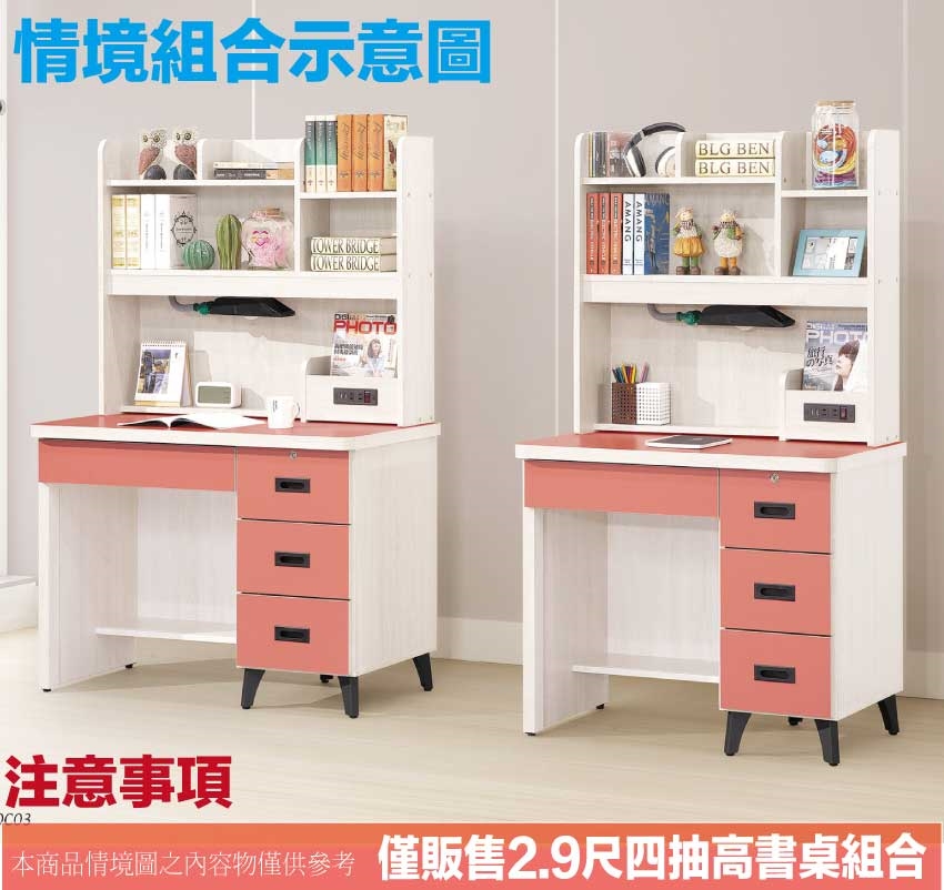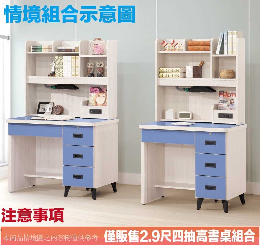 【文創集】馬達2.9尺四抽插座高書桌組合(六色可選+附LED可調書桌燈) 六色可選+安心材質製造,使用放心+搭配居家更便利,採用防蛀木心板+防潮耐磨底座+五金滑軌結構等安心材質製造 ,外層採用防潮耐磨噴漆處理搭配採用四抽屜+開放多層格+可調書桌燈+便利插座設置等收納空間設計,全由專人配送到家,專業安心服務,替你省下更多時間!