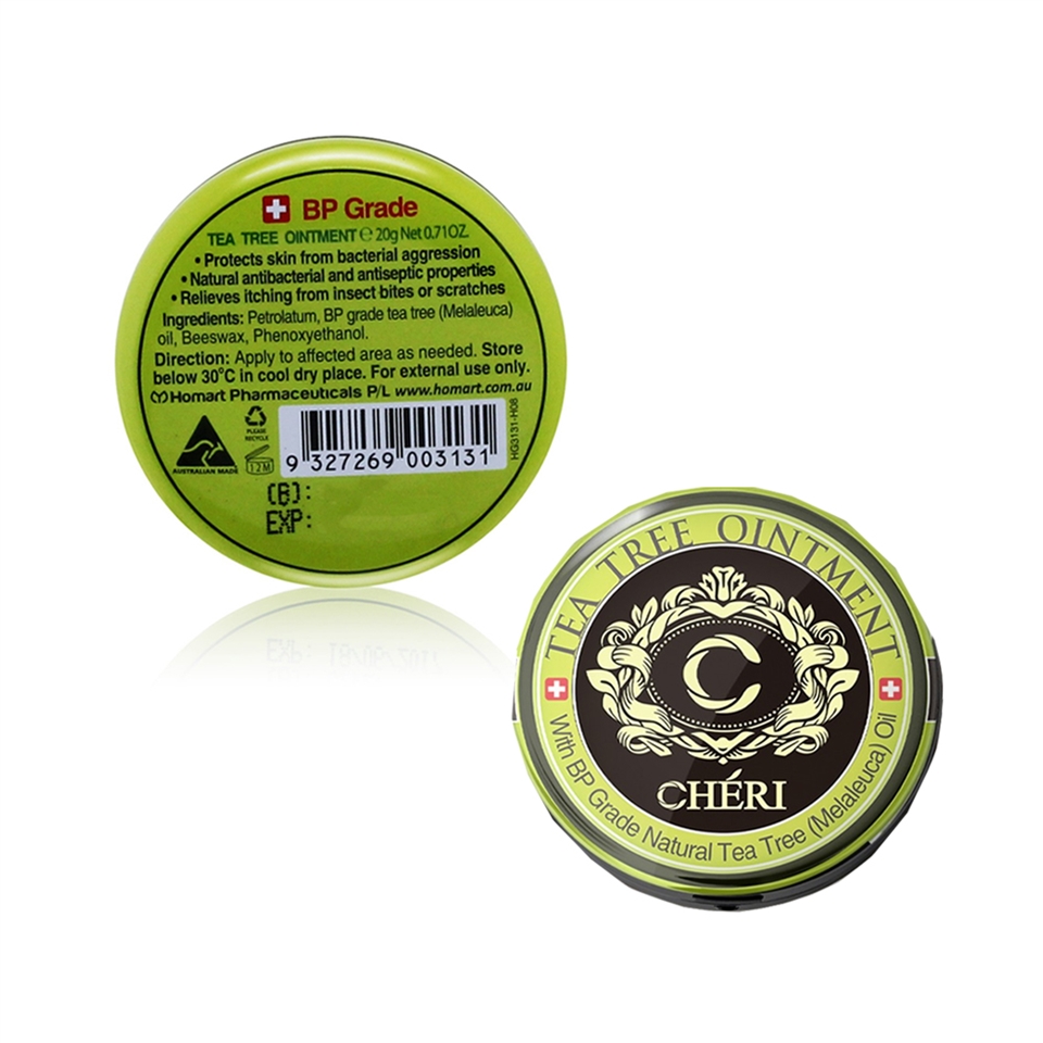 澳洲醫美級品牌CHERI的茶樹軟膏使用溫和的凡士林及蜂蠟搭配BP級茶樹(白千層)油 使用起來,既溫和又有效果,對肌膚既滋潤又不黏膩、茶樹味道純粹。