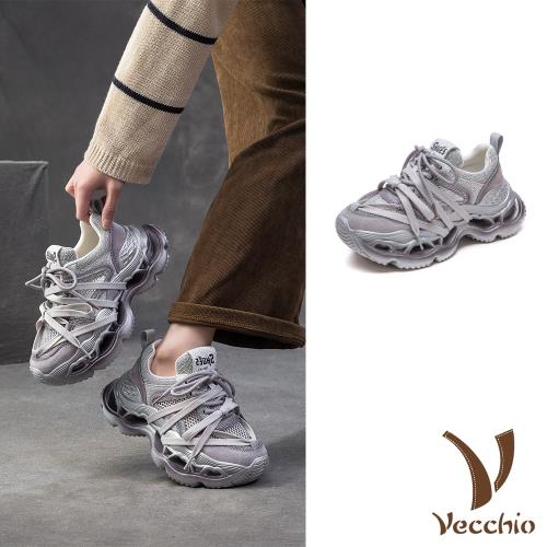 【VECCHIO】真皮閃鑽厚底老爹鞋/真皮頭層豚皮異材質拼接閃鑽厚底老爹鞋 運動鞋 女鞋 灰
