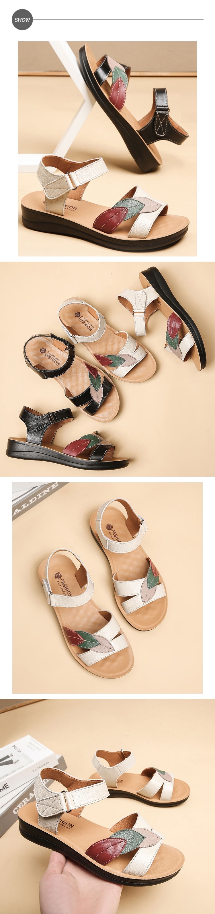 【MOM】真皮彩色葉片坡跟涼鞋/真皮頭層牛皮彩色葉片造型時尚坡跟涼鞋 女鞋 米