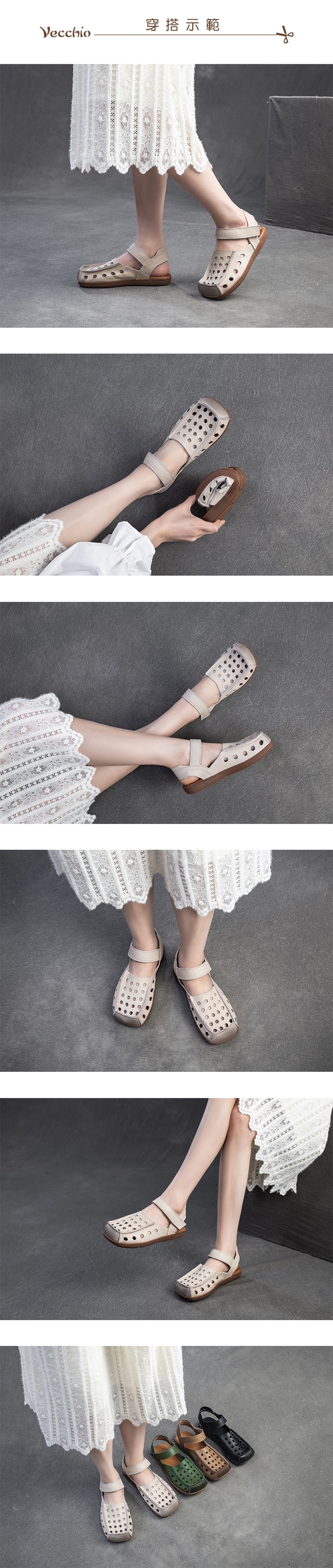 【VECCHIO】真皮洞洞方頭平底包頭涼鞋/真皮頭層牛皮縷空洞洞寬楦方頭魔鬼粘平底包頭涼鞋 女鞋 米
