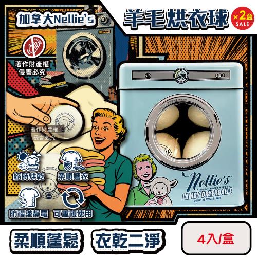(2盒8入超值組)加拿大Nellies-烘衣機專用速乾柔順100%純羊毛烘衣球4入/復古存錢筒鐵盒(可重複使用約1000次,防靜電環保乾衣球)