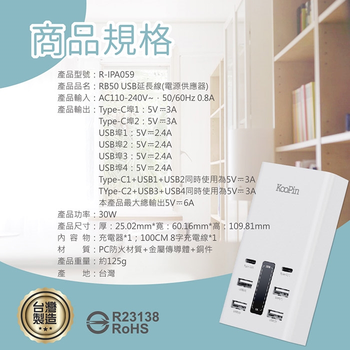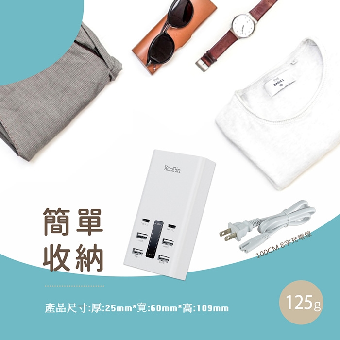 KooPin 台灣製造 30W 六孔智慧分流快速充電器(2USB-C+4USB-A)