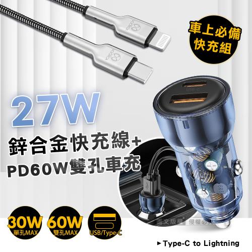 VOORCA 27W鋅合金快充 Type-C to Lightning 快充線+PD60W 速充雙孔車充頭