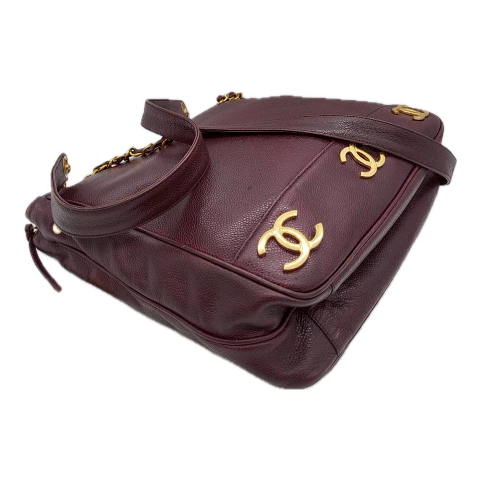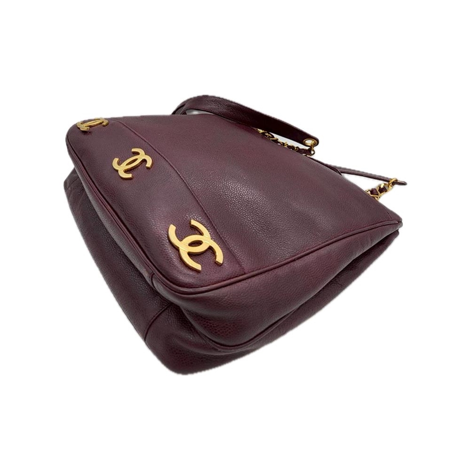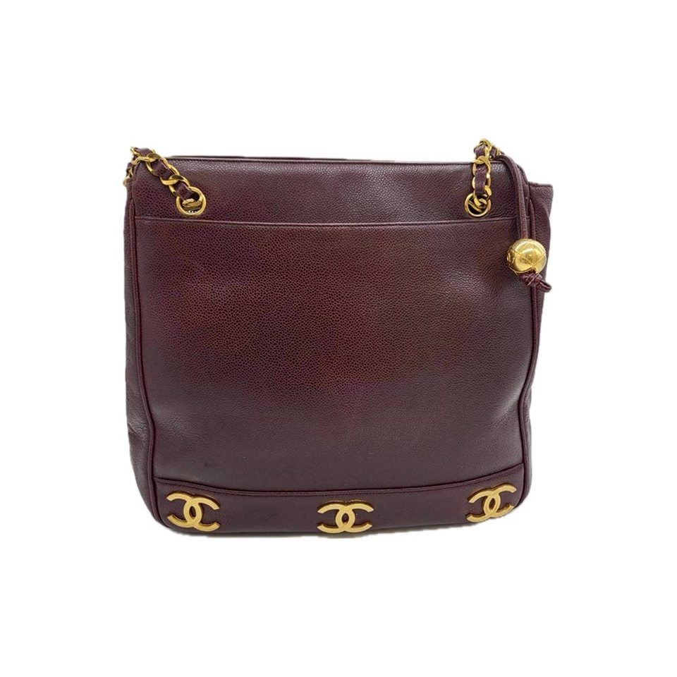 這款 CHANEL 側背包以 酒紅色魚子醬皮革 搭配 6 個經典雙C金色Logo,底部點綴低調卻極具辨識度。肩背鍊帶設有 金屬金球裝飾,展現品牌獨有的優雅細節。