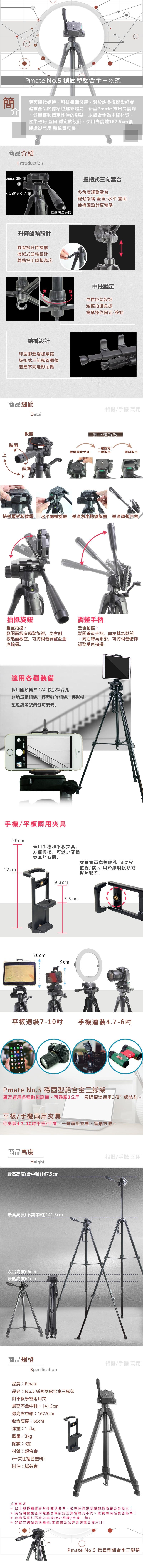 Pmate No.5 穩固型鋁合金三腳架 附平板手機兩用夾