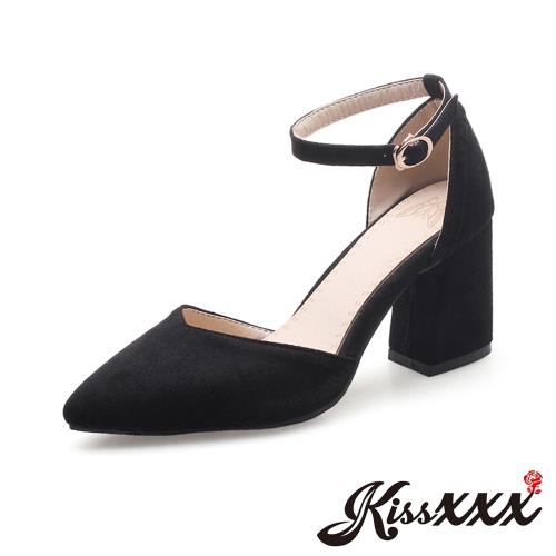 【KISSXXX】繞踝尖頭V口粗跟涼鞋/黑色滾邊繞踝飾帶尖頭V口粗跟涼鞋 女鞋 黑