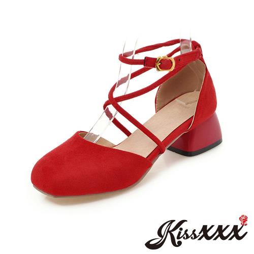 【KISSXXX】小方頭粗跟涼鞋/小方頭交叉細繩繞帶造型粗跟涼鞋 女鞋 紅