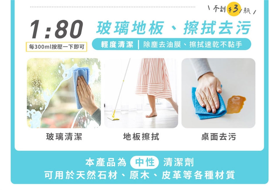 -輕度清潔去污、除塵去油膜、擦拭速乾不黏手