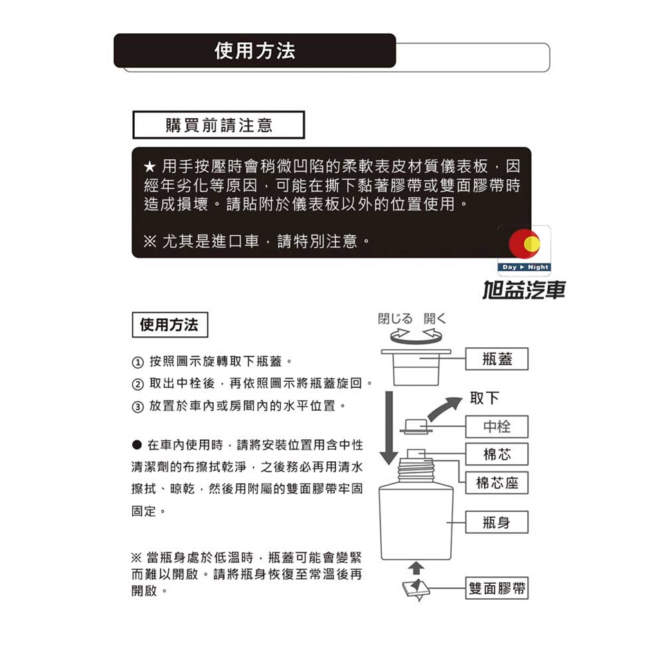 *請注意,表面柔軟的儀表板在用手指按壓時可能會略微凹陷,因此在撕下膠帶時可能會損壞儀表板。 香味持續約30天